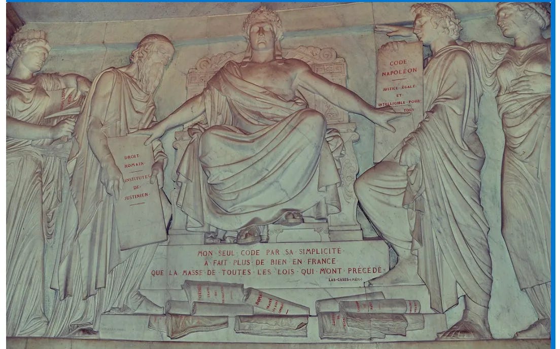 Perhaps the strongest evidence of the Civil Code’s ambivalent relationship with the ius commune can be found in the story that French jurists even today like to tell themselves about its enactment, which is conveniently summarized in one of the ten reliefs that adorn Napoleon’s tomb. As that relief celebrates Napoleon’s enactment of the Code, we quite fittingly find him pointing, on the right-hand side (his left) to a raised-up slab inscribed with the words “Code Napoleon” and “Equal and Intelligible Justice for All”. On the left (Napoleon’s right), we find him pushing himself up by simultaneously pushing down on another slab bearing the words “Roman Law” and “Justinian’s Institutes”. And at Napoleon’s feet, discarded, are the works of the French jurists Jean Domat and Robert-Joseph Pothier, on which the work of the codifiers had heavily drawn, as well as the local customs of the North of France, such as the Custom of Paris, which the Code had served to displace. The caption at the centre of the relief, finally, serves to tie the whole of its message together: “My Code alone by its simplicity has done more good in France than the whole mass of laws that have preceded me.”